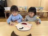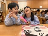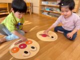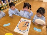 幼児クラスでは目隠しをして福笑いに挑戦!「もっと右!」「そこそこ!」とお友だち同士で声をかけ合いながら、協力して楽しむ姿が見られました。完成した顔を見て「おめめがあごにある~!」と大笑いする子どもたち。伝統的なあそびを通して、友だちとの関わりや表現する楽しさをたっぷり味わうことができました。