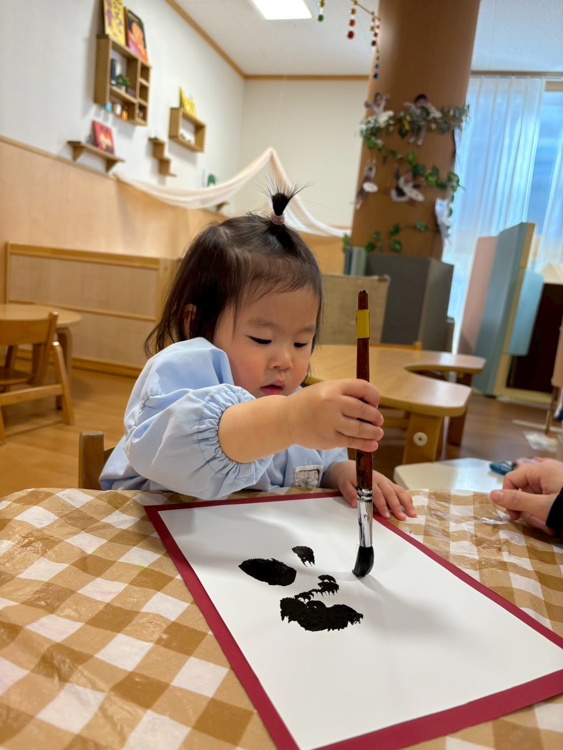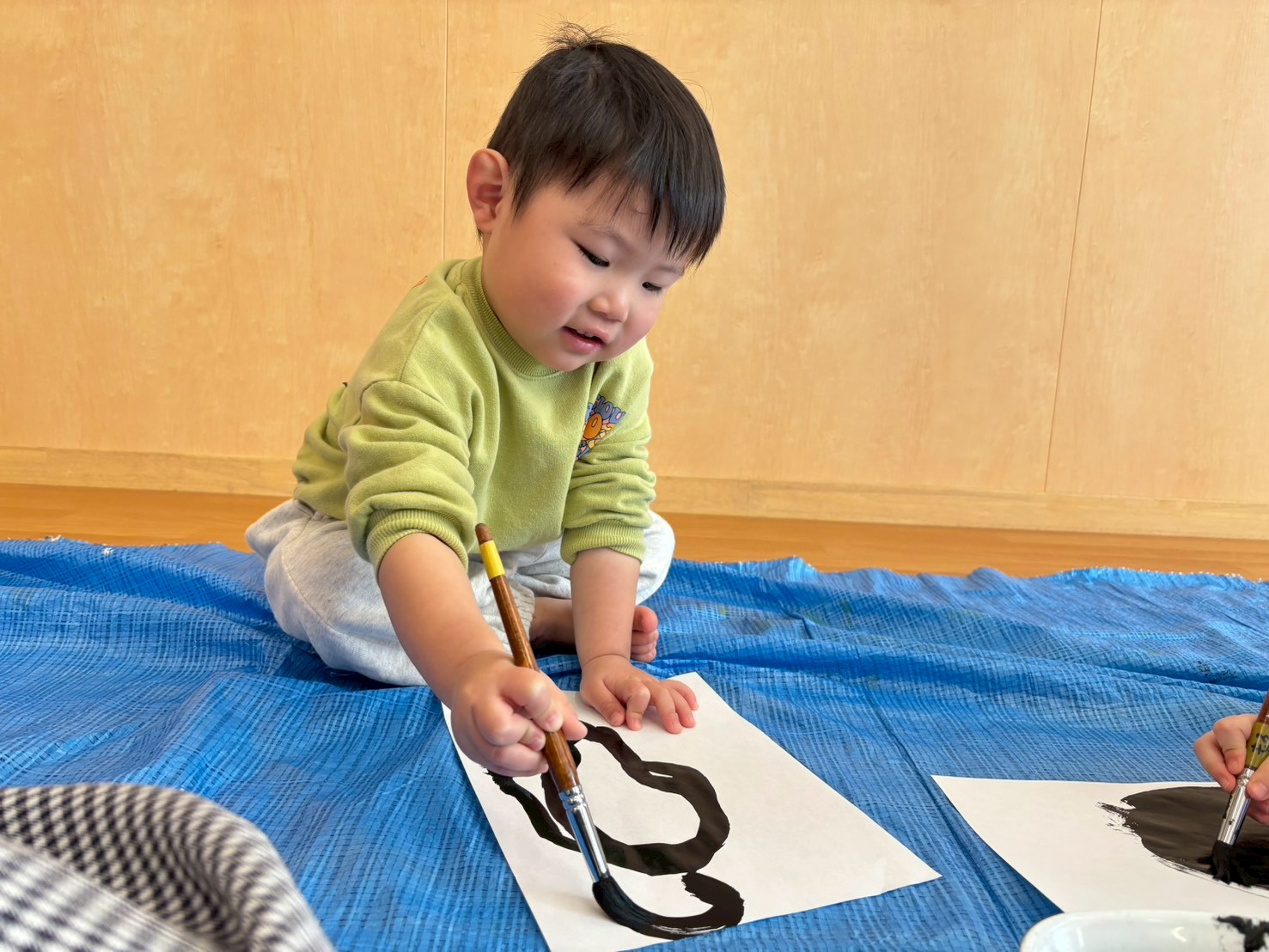 新しい年のはじまりに、園ではお正月ならではのあそびを楽しみました。乳児クラスでは、初めての書初めに挑戦!小さな手で筆を握り、真剣な表情で紙に向かう姿がとても印象的でした。筆の感触や絵具のにおいに興味津々で、それぞれの“はじめて”を楽しんでいました。福笑いでは、できあがったお顔に「なんだかへんなおかお~!」と笑い声があふれ、にぎやかな時間になりました。
