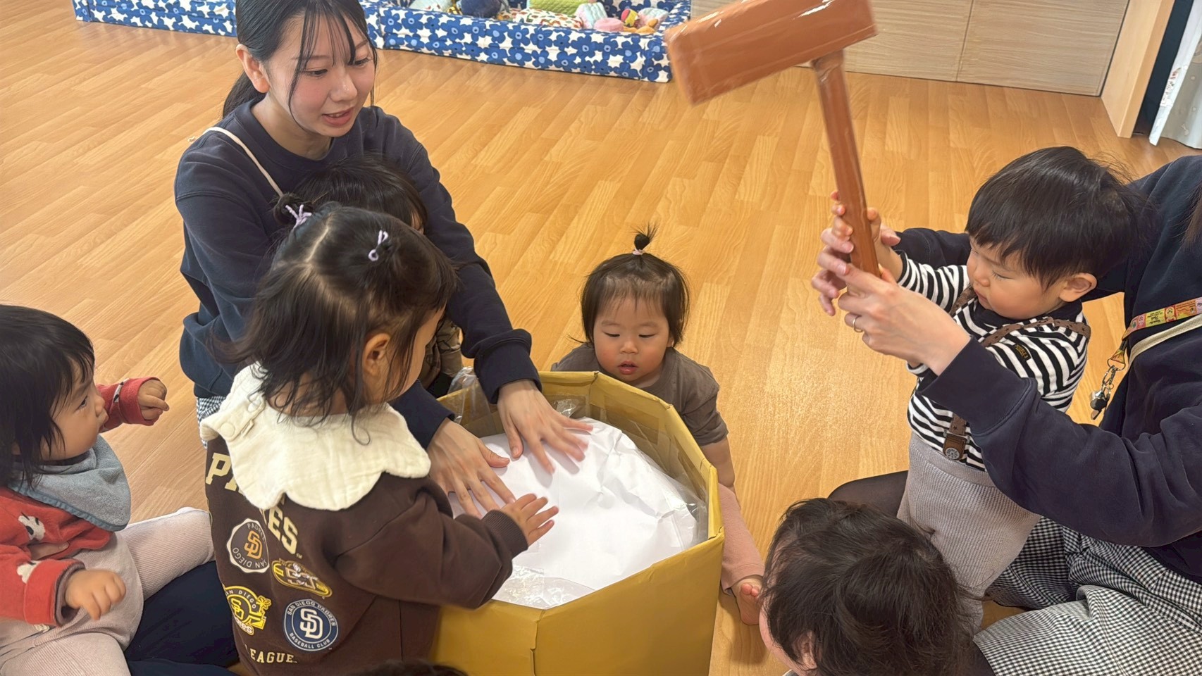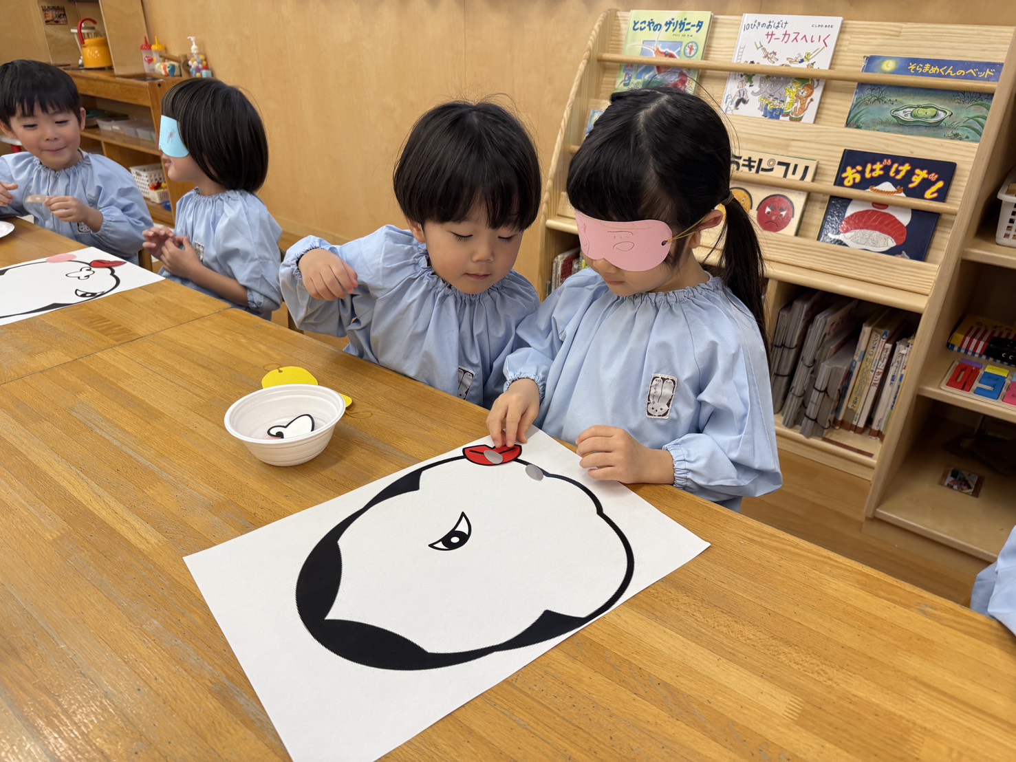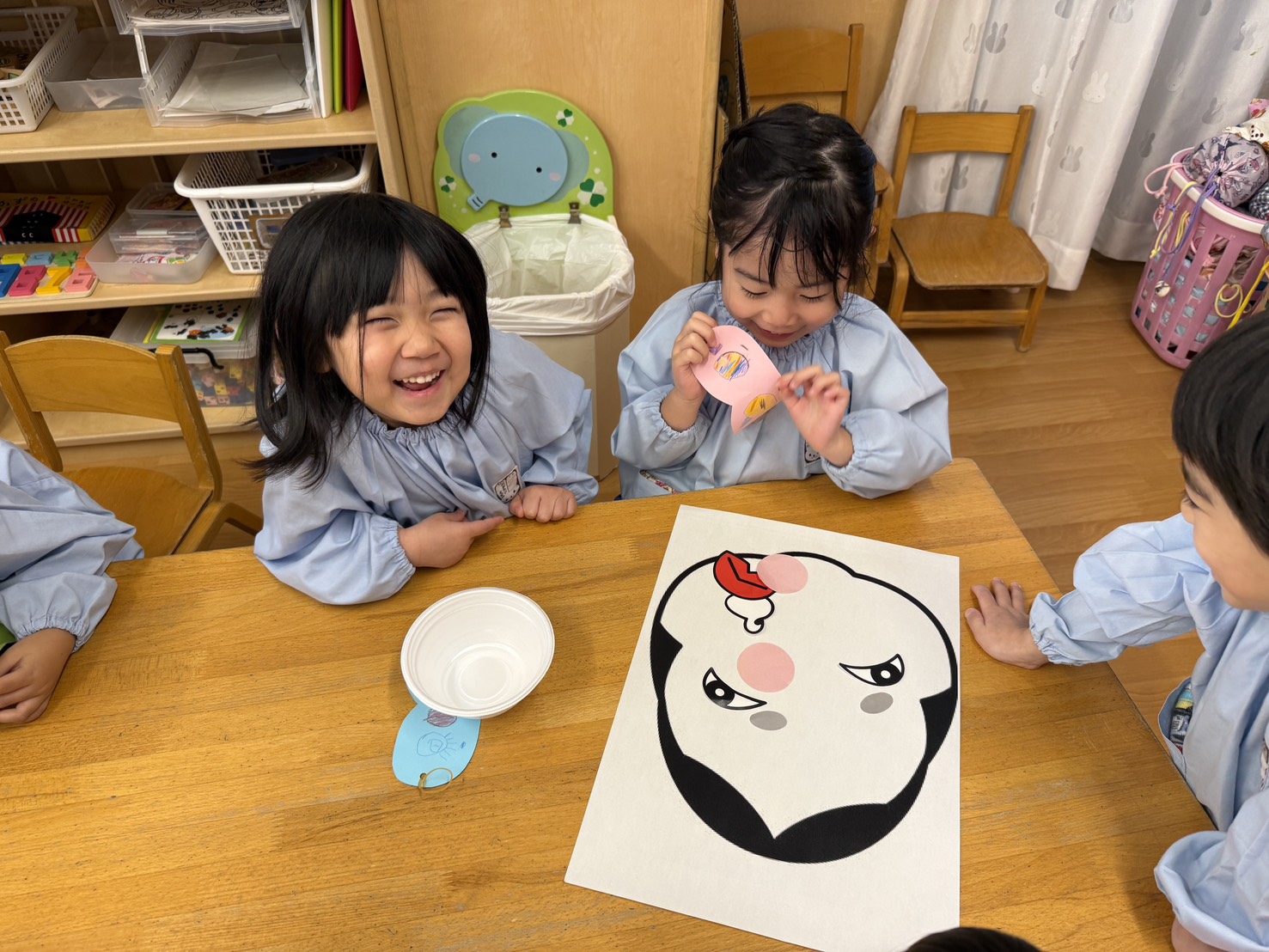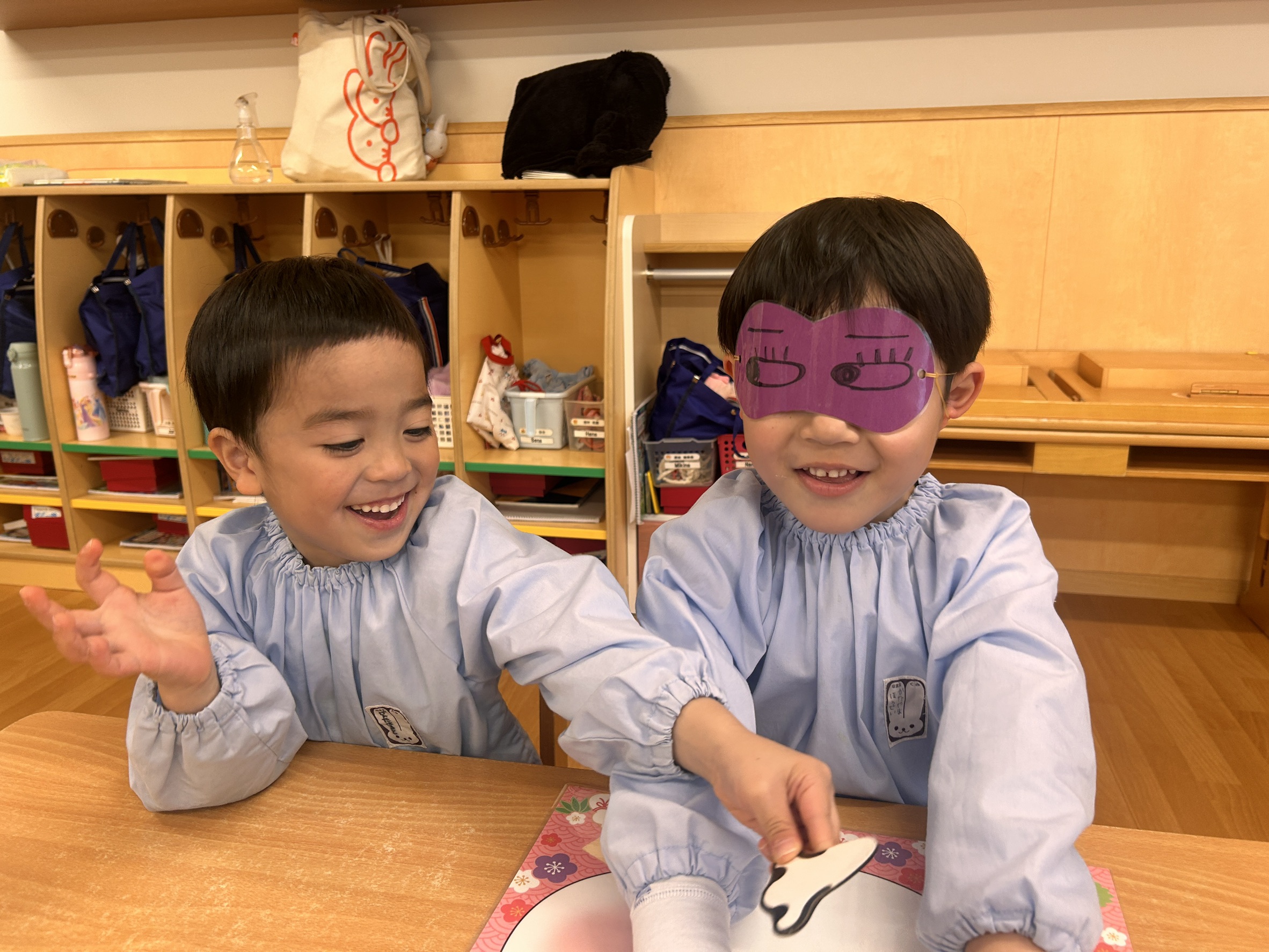 幼児クラスでは目隠しをして福笑いに挑戦!「もっと右!」「そこそこ!」とお友だち同士で声をかけ合いながら、協力して楽しむ姿が見られました。完成した顔を見て「おめめがあごにある~!」と大笑いする子どもたち。伝統的なあそびを通して、友だちとの関わりや表現する楽しさをたっぷり味わうことができました。
