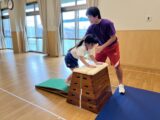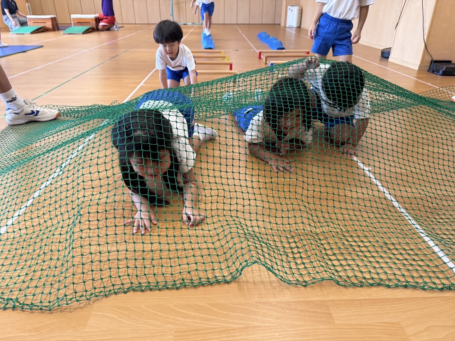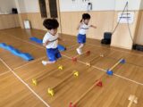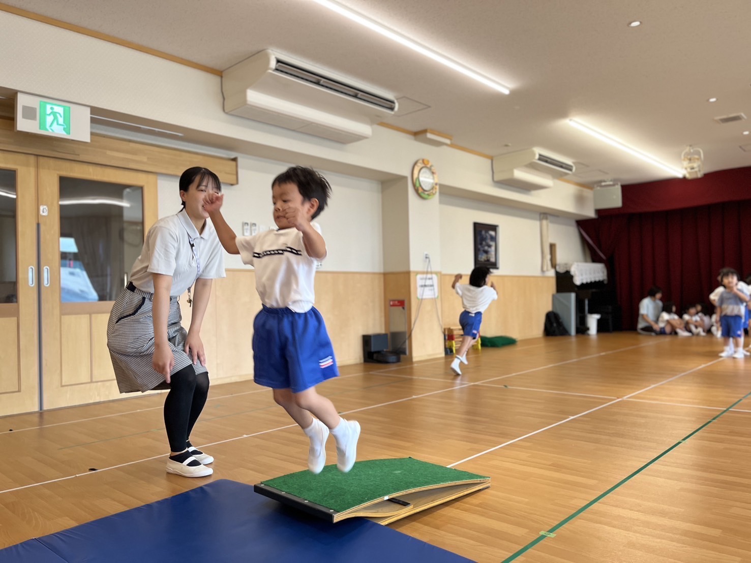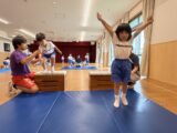 3才児クラスは、マットや平均台、ハードル等の運動用具に挑戦します。まずは柔軟体操でしっかりと身体をぐして…平均台では、落ちないように上手にバランスをとり、ハードルではしっかりと両足をあげてジャンプ!!マットや跳び箱では、最後にしっかりとポーズも決めてくれました。