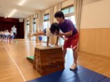 4才児クラスでは、跳び箱に挑戦!3才では、跳び箱に跳び乗っていましたが、4才では5段の跳び箱にチャレンジ。先生に補助をしてもらいながらですが、みんな元気いっぱい跳んでいます。