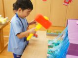 今日は夏祭りごっこの日です。この日の為に子ども達はお友達と一緒にお店屋さんの準備をしてきました。