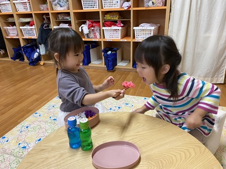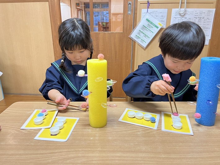 またお部屋でのコーナー遊びにも、お箸を使った遊びを取り入れ、子どもたちが楽しんでお箸に親しめるよう工夫しています。3才児クラスでは、2才児以上にお友達との関りが深まり、仲良しのお友達と好きな遊びを楽しむ様子がみられます♪