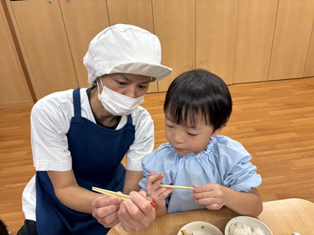 3才児クラスでは、秋ごろからお箸を持つ練習を始めます。お給食の時間になると、いつもおいしい給食を作ってくれる、給食の先生がお箸の持ち方を教えてくれます。はじめは難しく疲れてしまうので、少しの時間から始めます。クラスで一斉に進めず、グループごとに取り組み、丁寧に声掛けができるようにしています。