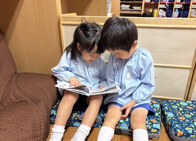 2才児クラスでは育児担当制により、日頃の生活を大切にしながらゆったりと遊んでいます。春頃はまだまだ個々の遊びも多く、同じ玩具でお友達と遊んでいるだけでしたが、半年たった今ではお友達とおもちゃを一緒に使い、簡単な言葉でやり取りを楽しみながら遊ぶようになってきました。先生に絵本を読んでもらうことも大好きです!