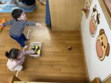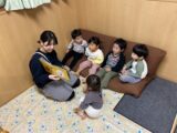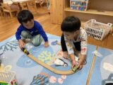 保育室には、自由に使える製作コーナーがあり、画用紙やマジック・折り紙・のりなどを使って思い思いに作りたいものを作る姿があります。手先を器用に使いハサミで細かいものを切ったりすることも楽しんでいます!