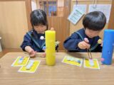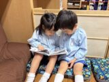 4才クラスでは虫に興味を持つ子どもが多く、公園に行った際は昆虫採集に夢中です。虫を捕まえると、図鑑で何の虫か、何を食べるのか等を調べる姿が見られます。しばらくすると、子どもたちから「秋の虫図鑑を作りたい!」との声が上がり、秋の虫の写真をハサミで形どって画用紙に貼り、クラス前に飾って見せ合う姿が見られました。