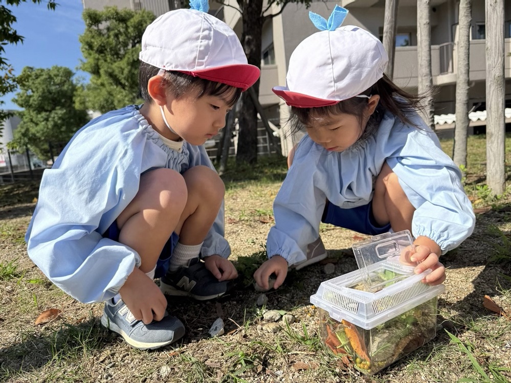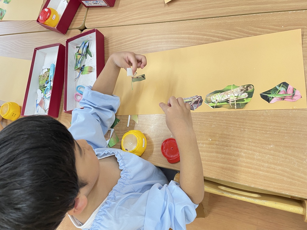 4才クラスでは虫に興味を持つ子どもが多く、公園に行った際は昆虫採集に夢中です。虫を捕まえると、図鑑で何の虫か、何を食べるのか等を調べる姿が見られます。しばらくすると、子どもたちから「秋の虫図鑑を作りたい!」との声が上がり、秋の虫の写真をハサミで形どって画用紙に貼り、クラス前に飾って見せ合う姿が見られました。