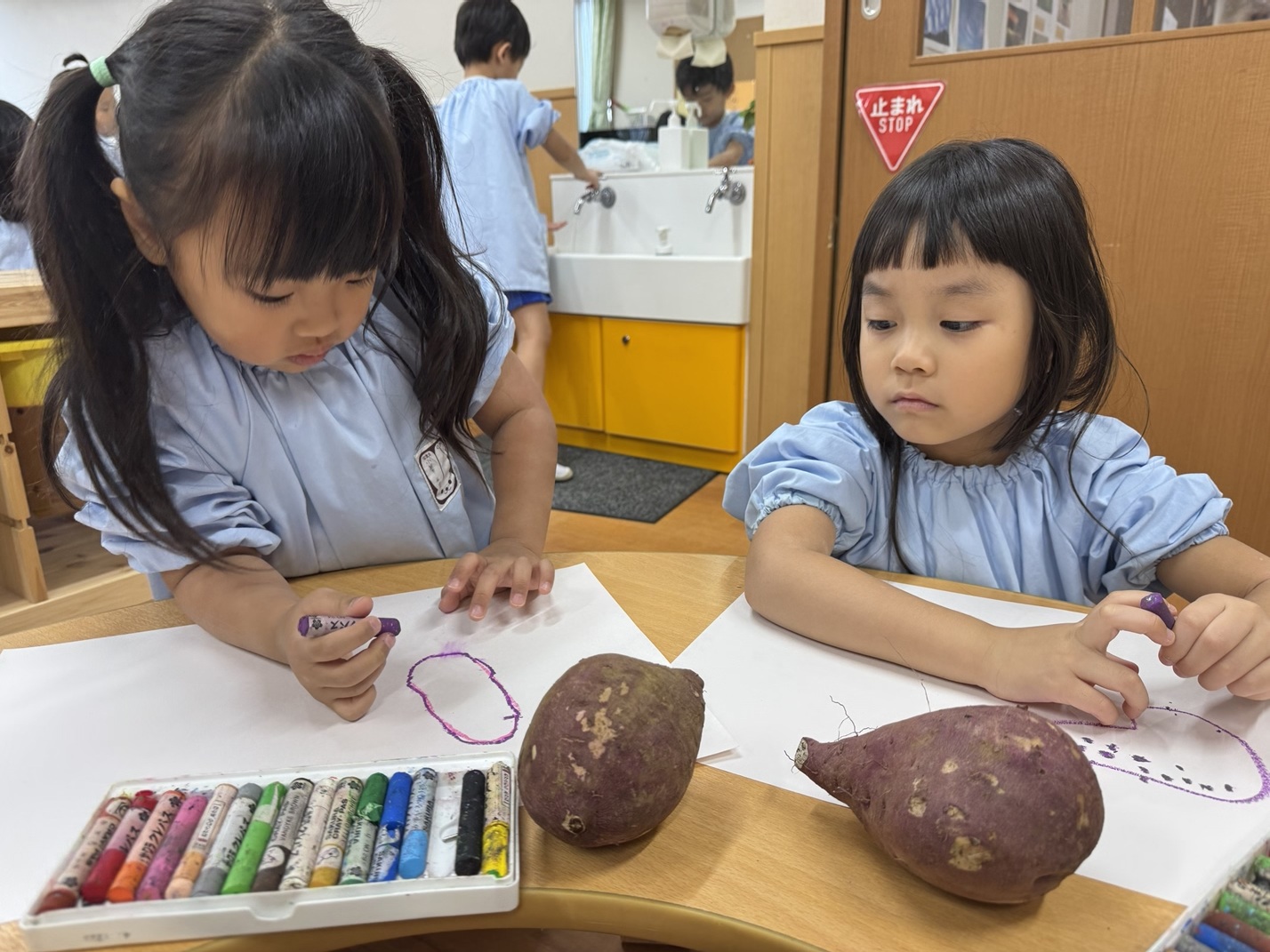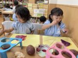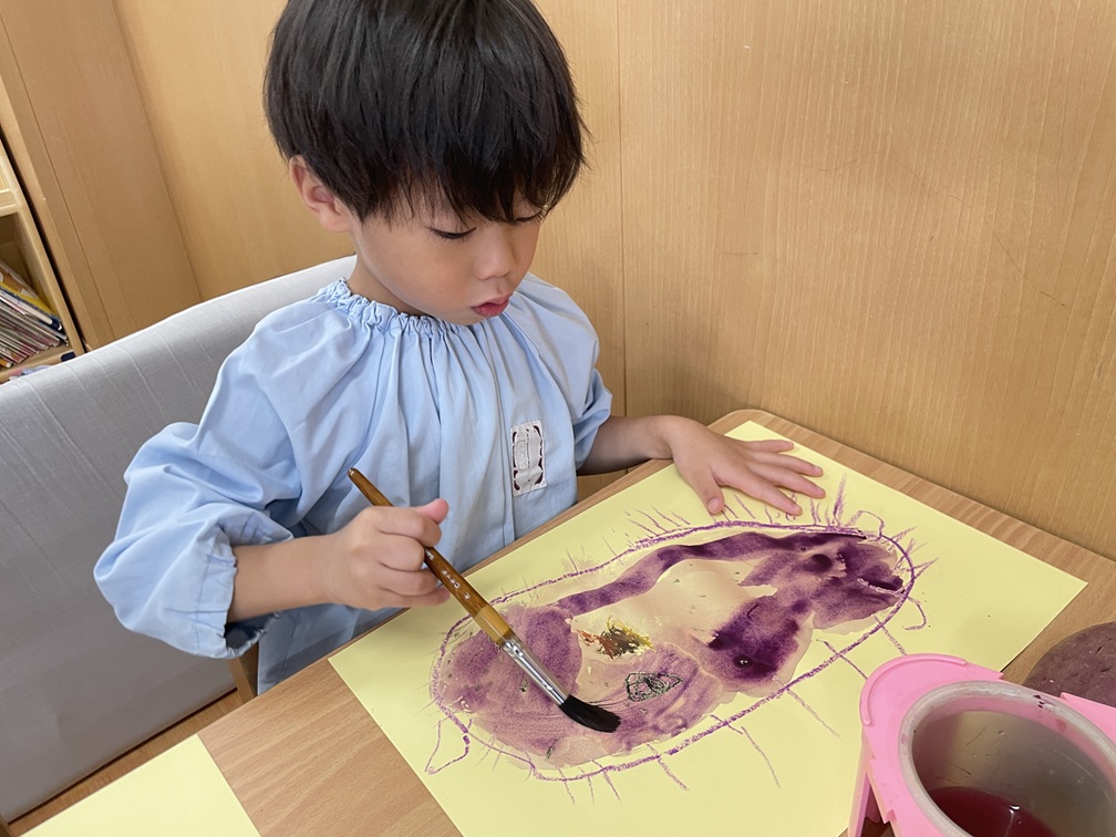 また、園でお芋ほりをした経験からクレパスや絵の具を使って、さつまいもを描きました。自分たちで絵の具を混ぜて、「ここは少し黄色いよ」「この色を作るには何色を混ぜたらいいかな・・・」と試行錯誤し、とっても美味しそうなお芋ができ上っていました。