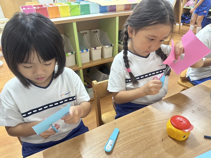 保育室には、自由に使える製作コーナーがあり、画用紙やマジック・折り紙・のりなどを使って思い思いに作りたいものを作る姿があります。手先を器用に使いハサミで細かいものを切ったりすることも楽しんでいます!